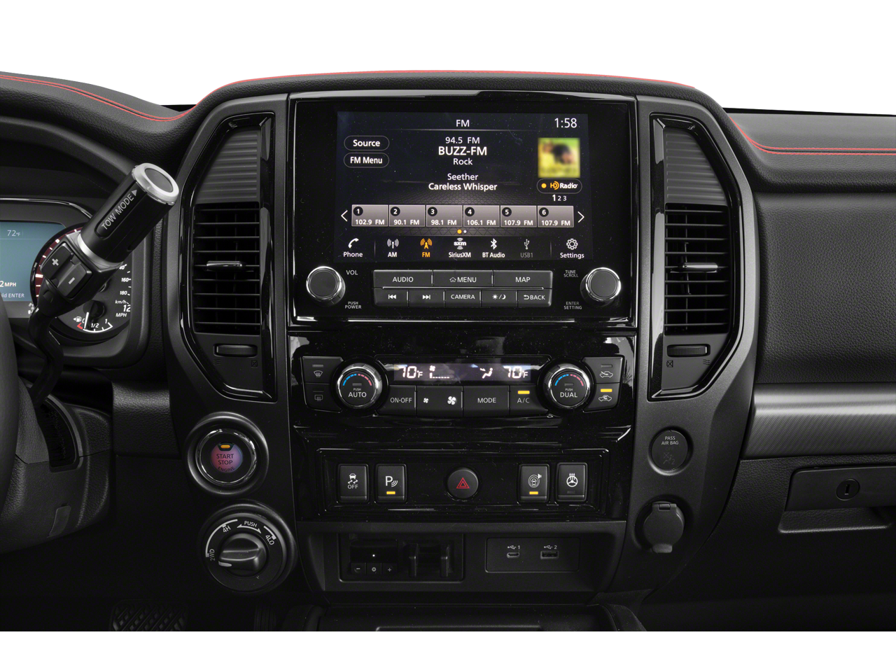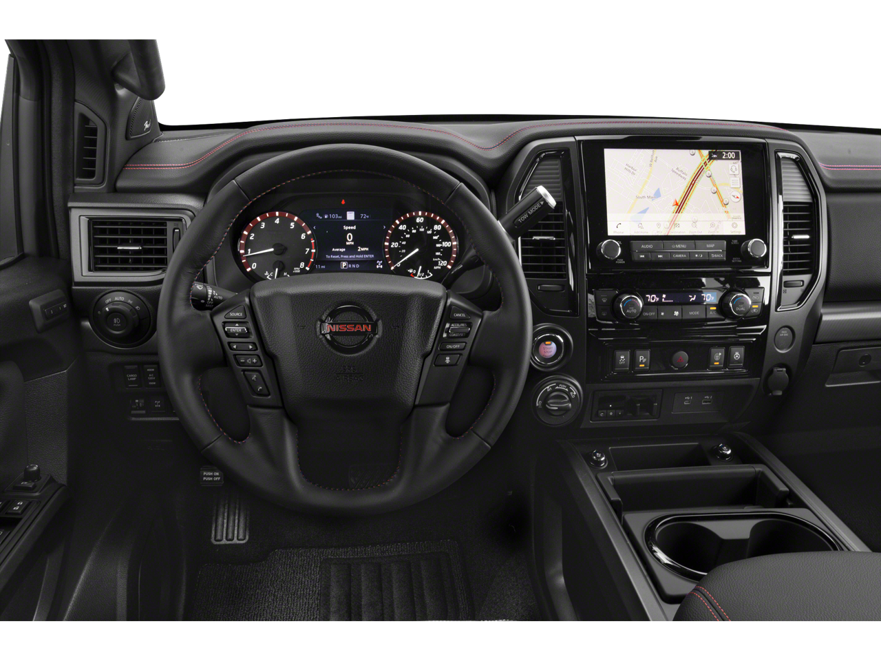 The Titan PRO-4X's impressive list of features is designed to enhance your driving experience and provide unmatched versatility. Enjoy the convenience of the Intelligent Around View Monitor, the practicality of the Utilitrack system, and the comfort of the heated and ventilated front seats. The available Fender Premium Audio System with 12 speakers will immerse you in a concert-quality listening experience, while the panoramic moonroof allows you to take in the great outdoors.