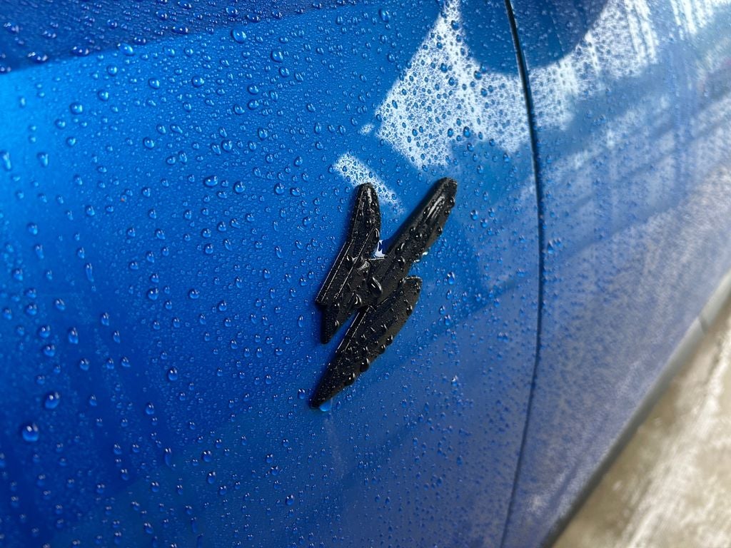 Meticulously equipped, the Hornet R/T Plus boasts an impressive array of features tailored to the discerning driver. Indulge in the R/T BLACKTOP + TRACK PACK BUNDLE, which includes Michelin brand tires, bright pedals, dual mode suspension, steel door sills, and a gloss black painted day light opening, among other sporty enhancements. The Blu Bayou blue exterior exudes a bold and confident presence, complemented by the striking red brake calipers and dark Hornet and R/T badges.